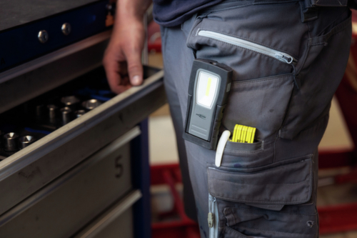 Mit Ein-/Aus-Schalter, USB-Anschluss mit schützender Gummiabdeckung, abgedeckten Magneten und Gürtelclip für den mobilen Einsatz. Leuchtdauer 2,5 - 6 h (bei von/bis-Angaben wird von max. Lumen bzw. min. Lumen ausgegangen). Spot 6 h. Leuchtweite 8 - 25 m. Abstrahlwinkel 120 °. Die 2-Stufen-Funktion ermöglicht das Einstellen der Lichtleistungen hoch - niedrig. Ladezeit 2,5 h. Display mit Ladeanzeige. Mit Akku-/Batteriebetrieb. Kompatibel mit Lithium-Polymer. Temperaturbeständig von +10 °C bis +25 °C. Schutzart IP65: Eindringen von Staub, Wasserstrahl aus allen Richtungen.