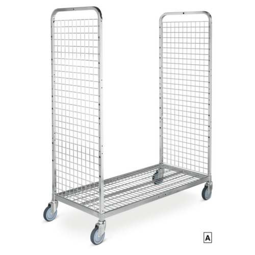 Das Basismodell (Bestell-Nr. 284998) ist mit 2 Gitterwänden, Boden und 4 Kautschuk-Lenkrollen (Ø 12,5 cm), ausgestattet. Zur Sicherung des Etagenwagens besitzen 2 der Rollen zusätzliche Feststellbremsen. Dadurch ist der Wagen besonders wendig und kann Ihre Güter ganz leicht transportieren. Die Konstruktion des Gestells besteht aus robustem Vierkantrohr. Die Maschenweite der Gitterwände beträgt 50 x 50 cm.