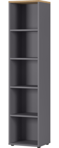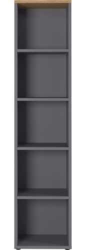 Die wichtigsten Maße des Büroregals GW-AGENDA auf einen Blick:Leicht zugänglicher Stauraum für Akten und Arbeitsunterlagen auf 5 Ordnerhöhen. Konstruktion aus Spanplatte mit pflegeleichter Melaminharzbeschichtung. Fachbodenkanten durch schlagfeste ABS-Umleimer vor unschönen Rissen und Ausbrechen an den Kanten geschützt. Korpus in graphit/Grandson-Eiche. Ebenen in graphit. Unterbau Gleitern.