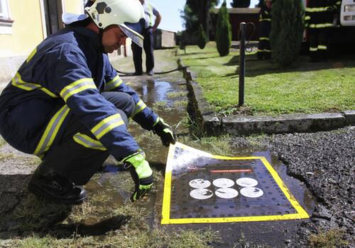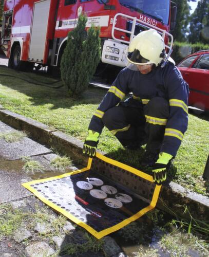 Geeignet für die schnelle Absicherung von Kanaleinläufen in jeglicher Form - sowohl in Notfällen, als auch zur Vorbeugung. Ausgestattet mit einer Magnetfolie, dank der sich die Kanalabdeckung sogar zusätzlich auch vertikal für Einläufe am Bordstein anwenden lässt. Verarbeitung extrem dicht und flexibel.