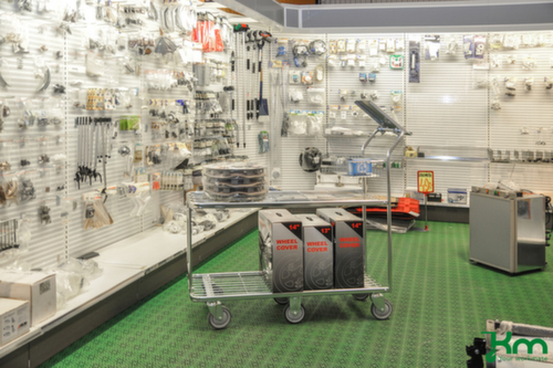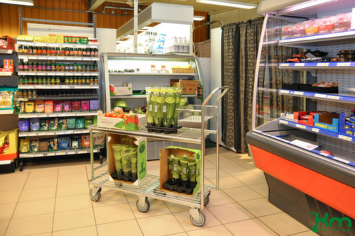 Konstruktion aus Stahl. Plattform durchbrochen mit Gitterboden. Schiebebügel mit Korb zum Sammeln und gesonderten Transportieren kleinerer Gegenstände. Gestell elektrolytisch verzinkt. Leicht zu verfahren dank robustem Fahrgestell aus 4 Lenk- und 2 Bockrollen, Feststeller an zwei Lenkrollen gewähren bei Bedarf stets einen sicheren Stand. Rad Ø 125 mm. Räder mit bodenschonender TPE-Bereifung. Naben mit Schwenklager. Dadurch wird eine 360°-Drehung ermöglicht.