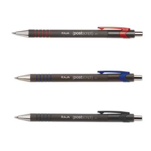 "longDescription": "<h2>Kugelschreiber postcript RAJA - rot</h2><p>Druckkugelschreiber sind die idealen Wegbegleiter für den Alltag. Die Kugelschreiber postcript RAJA sind leicht, verlässlich und wischfest.Durch den Gummigriffbereich am Stiftgehäuse liegt der Stift angenehm und ergonomisch in der Hand, wodurch ein angenehmes Schreibgefühl und ein sauberes Schriftbild entstehen.Das Stiftgehäuse ist transparent, so kann der Tintenstand immer eingesehen werden.Mit dem Taschenclip kann der Druckkugelschreiber an Ordnern oder Blöcken befestigt werden.Entdecken Sie jetzt unsere Kugelschreiber als RAJA Markenprodukt und überzeugen Sie sich von der Qualität! - Schreibfarbe: Blau - Lienienbreite: 0,7mm - Taschenclip - Druckkugelschreiber</p><br>",
