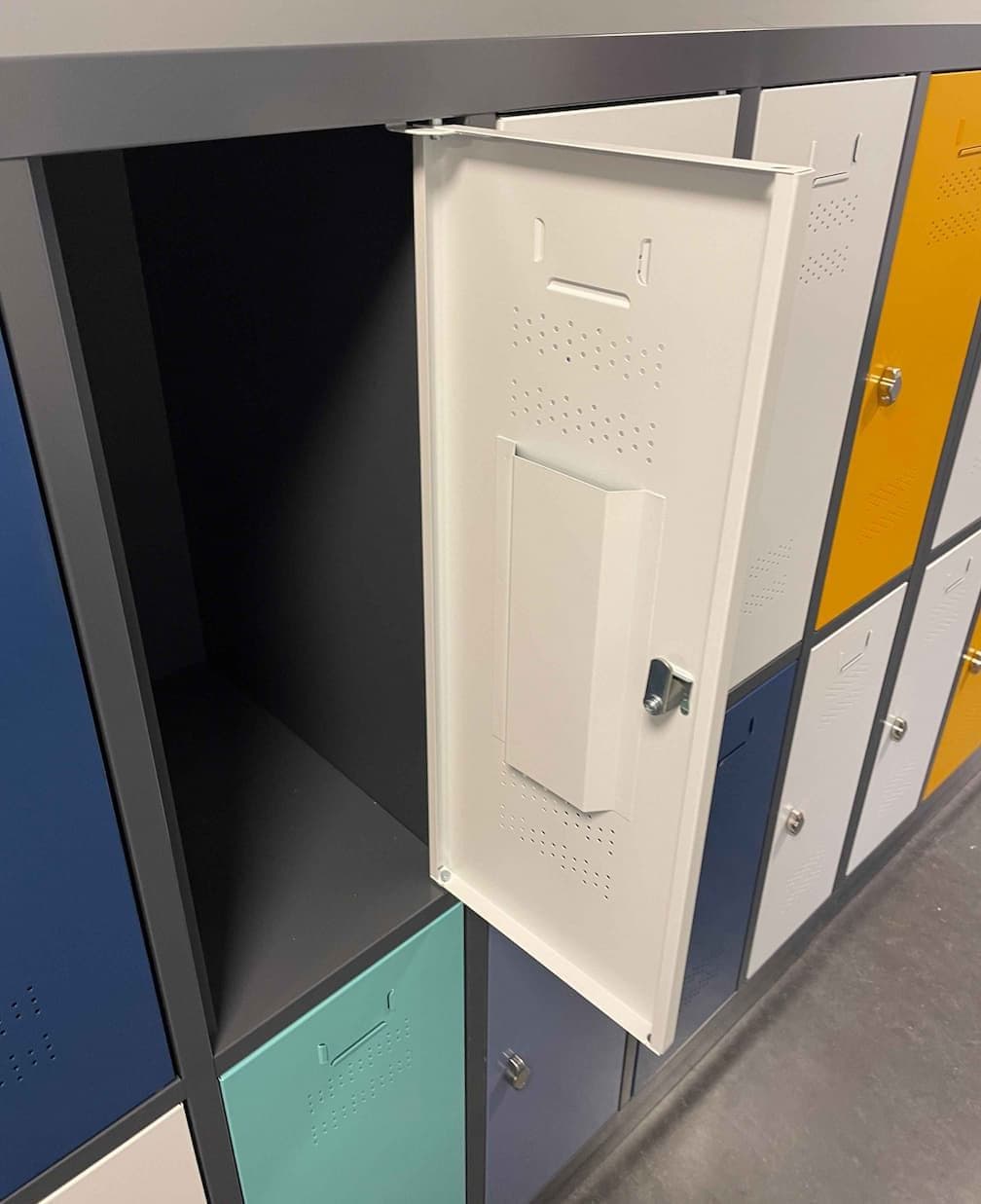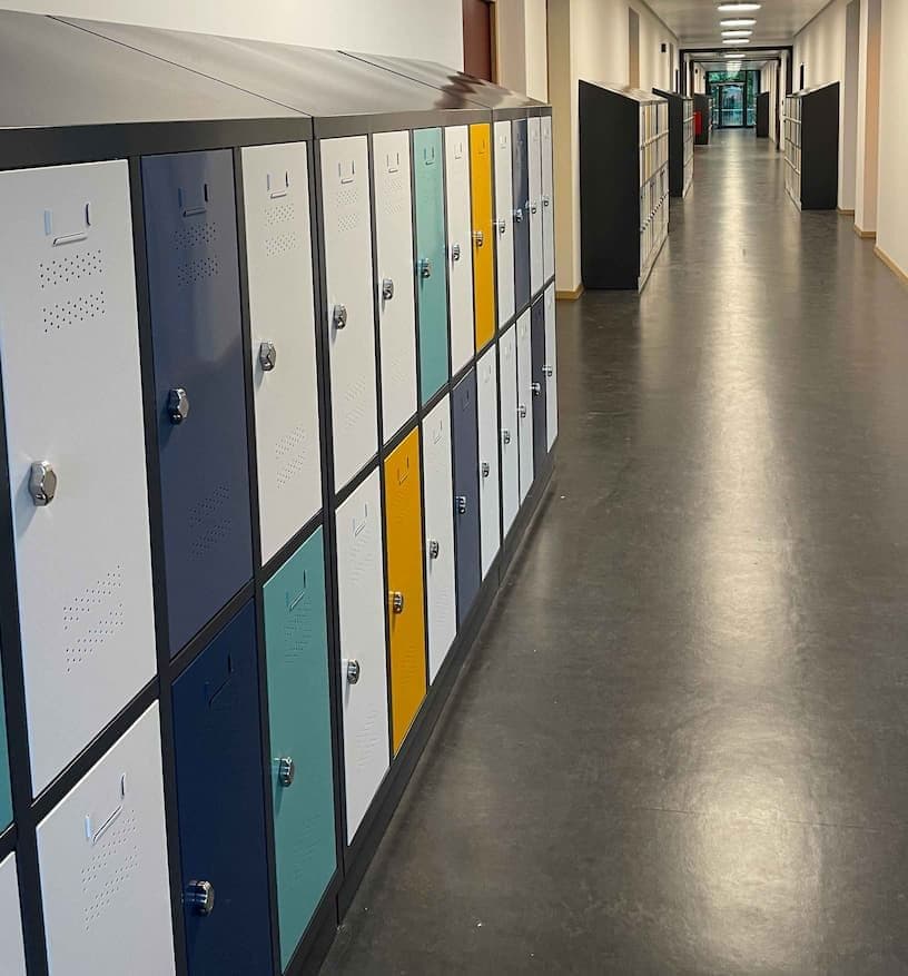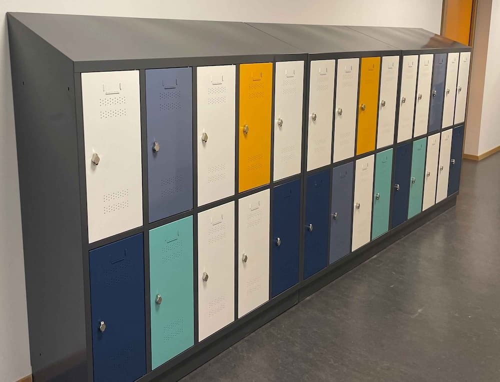 Bei der Projektberatung vor Ort wurde durch den UDO BÄR Fachberater der Nutzen der angefragten Höhe von 185 cm für eine Grundschule zur Diskussion gestellt, da für die Schüler:innen sicher eine geringere Gesamthöhe zur Erreichbarkeit der oberen Abteile sinnvoller ist – dem wurde zugestimmt. Angeboten wurden Garderobenspinde mit 2, 3 und 4 Abteilen nebeneinander und 2 Abteilen übereinander, Höhe 1.685 mm, inkl. Sockel, Schrägdach, Türen mit Lüftungslöchern, Etikettenhalter, Öffnungsbegrenzer und Drehriegelverschluss. Türen und Korpus in Sonderfarben mit „türgenauer“ Vorgabe des Architekten zur farblichen Türverteilung.