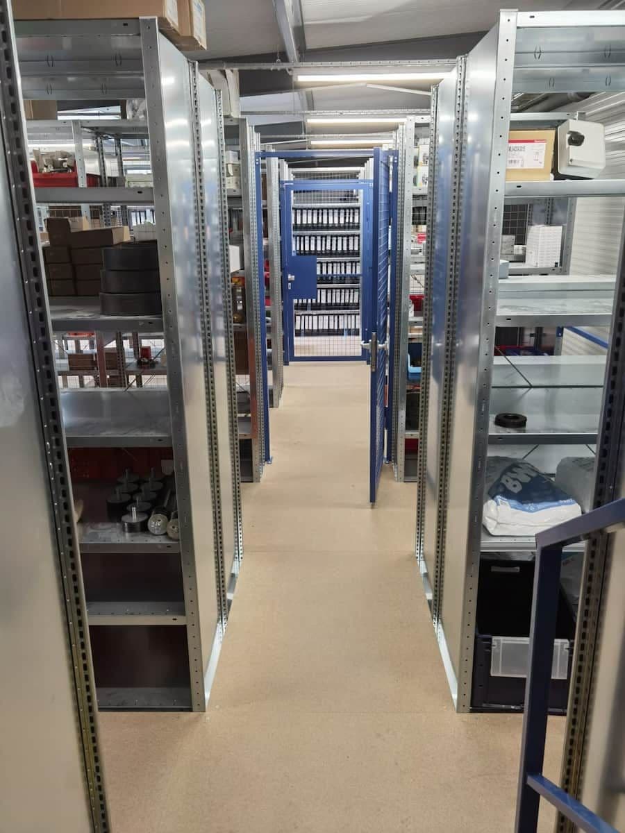 Lieferung, Montage und Inbetriebnahme: Herstellerauswahl: META Regalbau. Doppelstockregalanlage für das Heizungsbauzubehör, Kragarmregale für die Heizungsrohre und Palettenregale für die kompletten Heizkörper.