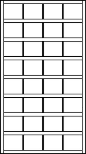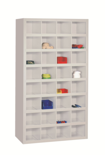 32 Fächer bieten genügend Stauraum um z. B. Papiere, Verbrauchsmaterial oder Ersatzteile sortiert zu lagern. 4 Fächer pro Ebene. Fächer mit Abrollrand (40 mm) und integrierter Etikettenleiste. Konstruktion aus Stahlblech mit schlag- und kratzfester Pulverbeschichtung. Korpus in RAL7035 Lichtgrau. Ebenen in RAL7035 Lichtgrau.
