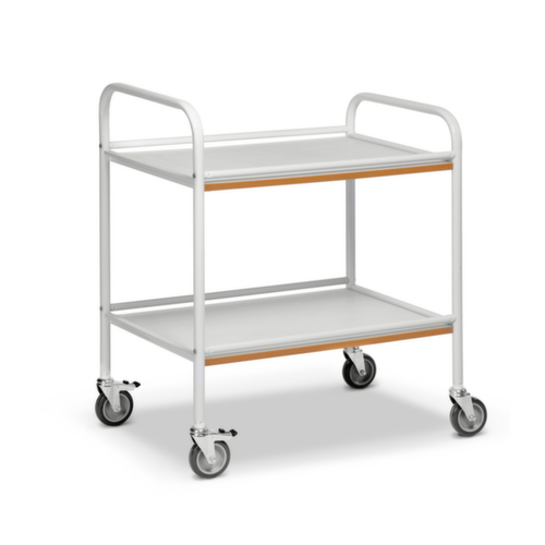 "longDescription": "<h2>Servierwagen aus Stahl weiß lackiert</h2><p>Der Servierwagen aus weiß lackiertem Stahl ist ein praktischer Alltagshelfer für den Transport von Produkten in Büros, Werkstätten, Gastronomie und vielen anderen Bereichen. Der moderne und ansprechende Stahlrahmen fügt sich nahtlos in jede Umgebung ein und sorgt gleichzeitig für Stabilität und Langlebigkeit. Sicher und praktisch Die erhöhten Seiten an den Ablageflächen sind ein besonderer Vorteil dieses Servierwagens. Sie verhindern, dass Produkte während des Transports herunterfallen, und gewährleisten so die Sicherheit Ihrer Gegenstände. Mit einer Traglast von 50 kg pro Ebene und insgesamt 100 kg bietet der Wagen ausreichend Kapazität für verschiedene Einsatzbereiche. Servierwagen aus Stahl leicht zu manövrieren Dank der vier Lenkrollen, davon zwei mit Feststellern, können Sie den Servierwagen mühelos manövrieren. Die Rollen haben einen Durchmesser von 100 mm, was für eine leichte und leise Bewegung sorgt, selbst auf unebenen Böden. Bei Bedarf können Sie die Feststeller aktivieren, um den Wagen sicher zu positionieren. Optimale Größe und Aufteilung Der Servierwagen hat eine Gesamtabmessung von 765 x 520 x 895 mm und bietet mit zwei Ablageflächen von 700 x 480 mm ausreichend Platz für eine Vielzahl von Produkten. Die obere Ebene befindet sich auf einer Höhe von 710 mm, und der Abstand zwischen den beiden Ebenen beträgt 400 mm, was genügend Raum auch für höhere Gegenstände bietet. Trotz seiner Stabilität und Funktionalität bleibt der Wagen mit einem Gewicht von 19 kg leicht genug für den einfachen Gebrauch. Vereinfachen Sie sich Ihre innerbetrieblichen Transporte mit unserem Servierwagen aus weiß lackiertem Stahl oder entdecken Sie weitere Transport- und Plattformwagenin unserem Shop!</p><br>",