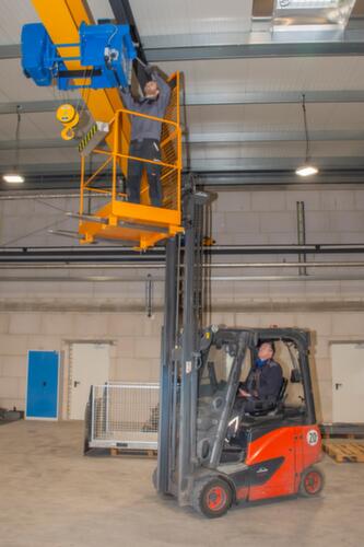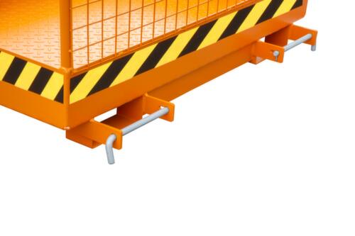 Die wichtigsten Maße des Bauer Stapler-Anbaugerätes auf einen Blick:Von der Breitseite einfahrbar. Einfahrhöhe x Einfahrbreite 80 x 200 mm. Einfahrtaschenabstand 600 mm. Diverse Sicherheitsausstattungen sorgen dafür, dass Sie sich vollkommen auf Ihre Aufgabe konzentrieren können. Der Einstieg erfolgt über das Heben der seitlichen Sicherheitsstange. Die hohe Gitterrückwand verhindert, dass Sie beim Arbeiten unbeabsichtigt in die Hebetechnik des Staplers geraten. Zusätzlich bietet der Korb Anschlagpunkten, an denen Sie sich mit Ihrer Absturzsicherung direkt einklinken können. Mit Werkzeugablage - so haben Sie benötigtes Werkzeug, Arbeitsmaterial und Kleinteile sofort zur Hand. Nicht kranbar. Aus Stahlrohr lackiert in RAL2000 Gelborange.