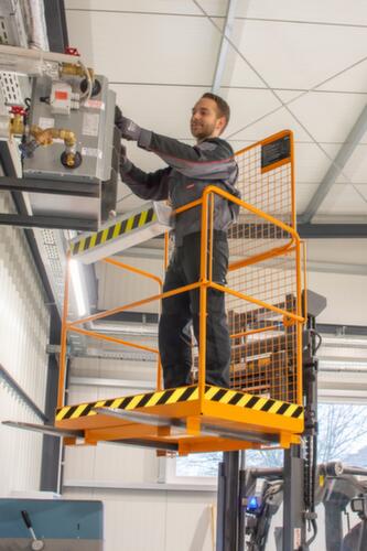 Besonders flexibel einsetzbar, da die Bühne sich mit einem Stapler aufnehmen und transportieren lässt. Geeignet für Reparaturen und Wartungsarbeiten, auch mit 2 Personen.