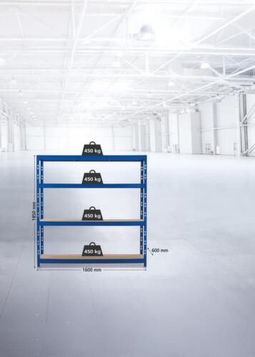 Die wichtigsten Maße des UDOBÄR Lagerregals auf einen Blick:4 Ebene(n) mit Holzboden. Fachhöhen je nach Einsatzzweck und Ihrem Bedarf im Raster von 150 mm verstellbar. Nutzung beidseitig - flexible Aufstellung frei im Raum möglich. Konstruktion aus Stahl, Ständer mit schlag- und kratzfester Pulverbeschichtung in RAL5017 Verkehrsblau, Ebenen mit schlag- und kratzfester Pulverbeschichtung in RAL5017 Verkehrsblau. Ständer mit Bodenplatten.