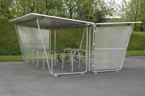 "longDescription": "<h2>Überdachung</h2><strong>Wetterschutz für Fahrräder</strong><br><ul><li><strong>Jederzeit erweiterbar</strong> durch Anbauelemente</li><li><strong>Korrosionsgeschützt</strong> - alle Stahlteile sind verzinkt</li><li><strong>Trockener Parkraum</strong> dank Pultdach aus verzinktem Trapezblech mit Beschichtung</li><li><strong>Leichte Eigenmontage</strong> - inklusive Montageanleitung, Bauzeichnung, Fundamentplan, ohne Befestigungsmaterial</li></ul><br><strong>Direkt mitbestellen:</strong><br><ul><li><strong>Rundum Schutz</strong> - Rückwand aus verzinktem Trapezblech mit Beschichtung und Seitenwand aus glattem, durchscheinenden Polyester, Stützrahmen aus Rundrohr und mit Anschlusswinkeln zum Aufdübeln</li></ul><br><strong>Sie haben die Wahl:</strong><br><ul><li><strong>Zur einseitigen Nutzung</strong> - für bis zu 12 einseitige Fahhrad-Einstellplätze</li><li><strong>Zur beidseitigen Nutzung</strong> - für bis zu 24 beidseitige Fahrrad-Einstellplätze und Dachrinne und Fallrohr aus PVC</li></ul><br><strong>Anlieferung!</strong><br><ul><li>Abladen mit Stapler oder Kran erforderlich</li><li>Fundamentarbeiten bauseits</li></ul>",