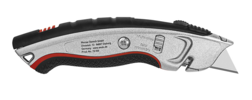 "longDescription": "<h2>Safety Cutter</h2><strong>mit automatischem Klingenrückzug </strong><br><ul><li>Für Rechts- und Linkshänder geeignet</li><li>Ergonomisch geformter Metallgriff mit gummierter Griffzone </li><li>Klinge federbelastet mit automatischem Klingenrückzug, sobald sie keinen Kontakt mehr mit dem Schneidegut hat</li><li>Von automatischem Klingenrückzug auf eine Multi-Stop-Rasterautomatik umschaltbar </li><li>Klingenaustritt bis 25 mm</li><li>Einfacher Klingenwechsel ohne Hilfsmittel</li><li>Mit integriertem Ersatzklingen-Magazin und Kordelschneider</li></ul><br><h3>Lieferumfang:</h3><ul><li>Inkl. 5 Trapez-Ersatzklingen</li></ul><br><h3>Prüfzeichen / Geprüft nach:</h3><ul><li>GS-Zeichen - TÜV geprüft</li></ul>",