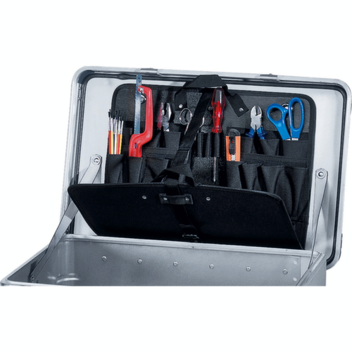 "longDescription": "<p><strong>Werkzeugtasche</strong></p><ul><li>Die transportable, herausnehmbare Aufbewahrungstasche für Werkzeug. Aus strapazierfähigem Gewebe.</li><li>Mit ausklappbarem Fach für leichte Zugänglichkeit der Werkzeuge.</li><li>Zum Selbsteinbau.</li><li>Montage von Bestell-Nr. 40627 mittels zweiteiliger Hohlnieten, Bestell-Nr. 40630 selbstklebend ausgestattet.</li><li>Passend zu Baureihen K424 XC, K470, Eurobox und ZARGES Box.</li></ul><br><p>Bitte beachten Sie: Die Abbildung ist dem Produkt ähnlich.</p>",